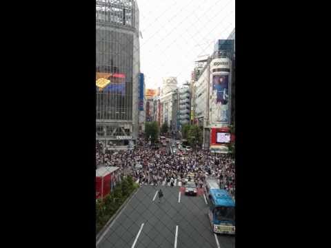 Aquí presentamos un paisaje del famoso Scramble intersección en Shibuya Tokyo en Japón. Está en frente de la estación de Shibuya. De semaforo se cambia a azul, personas cruzan la carretera todos a la vez. Parece como la batalla.